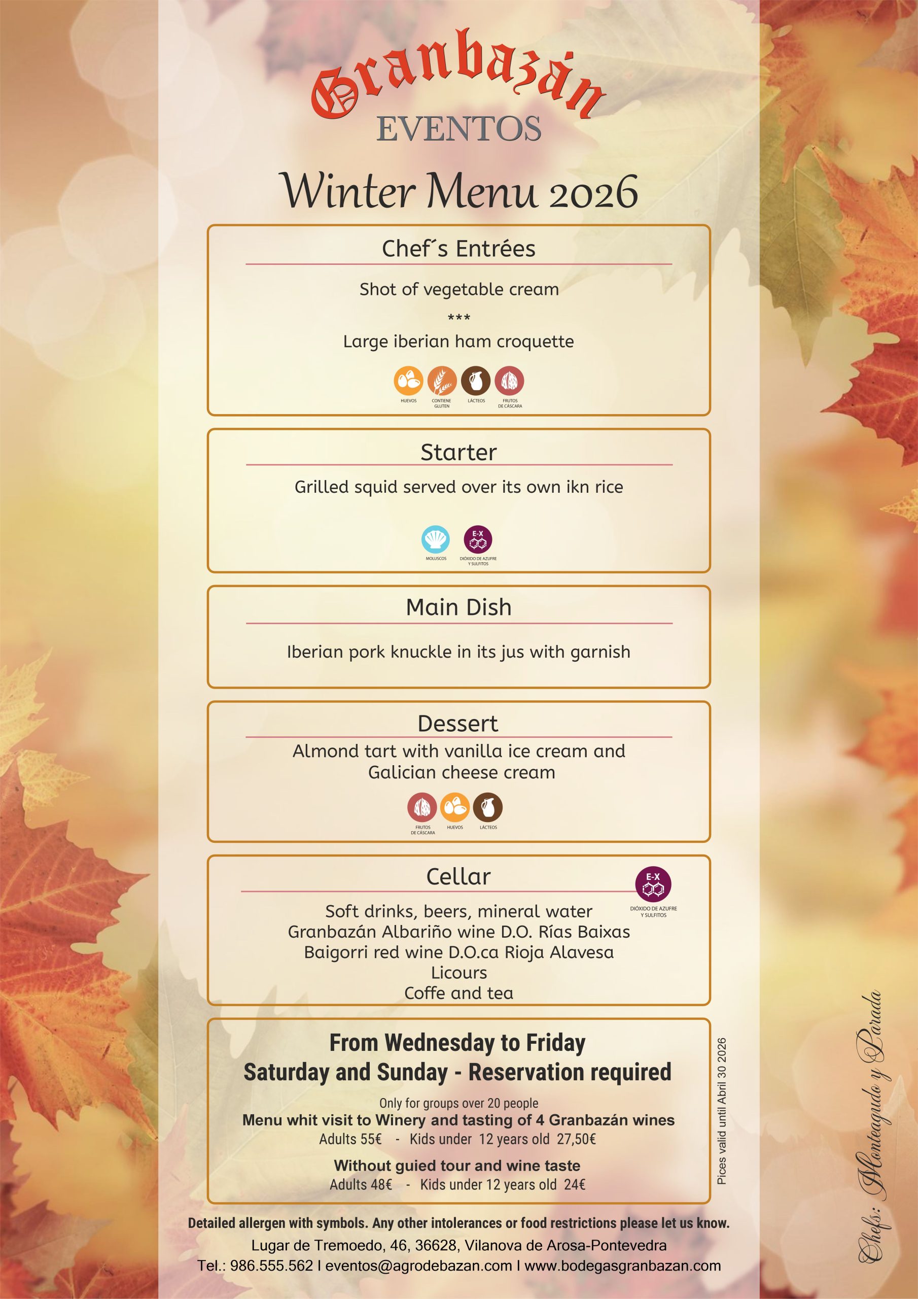 • Dates: From Wednesdays to Fridays. Saturdays, Sundays and holidays ask for availability.